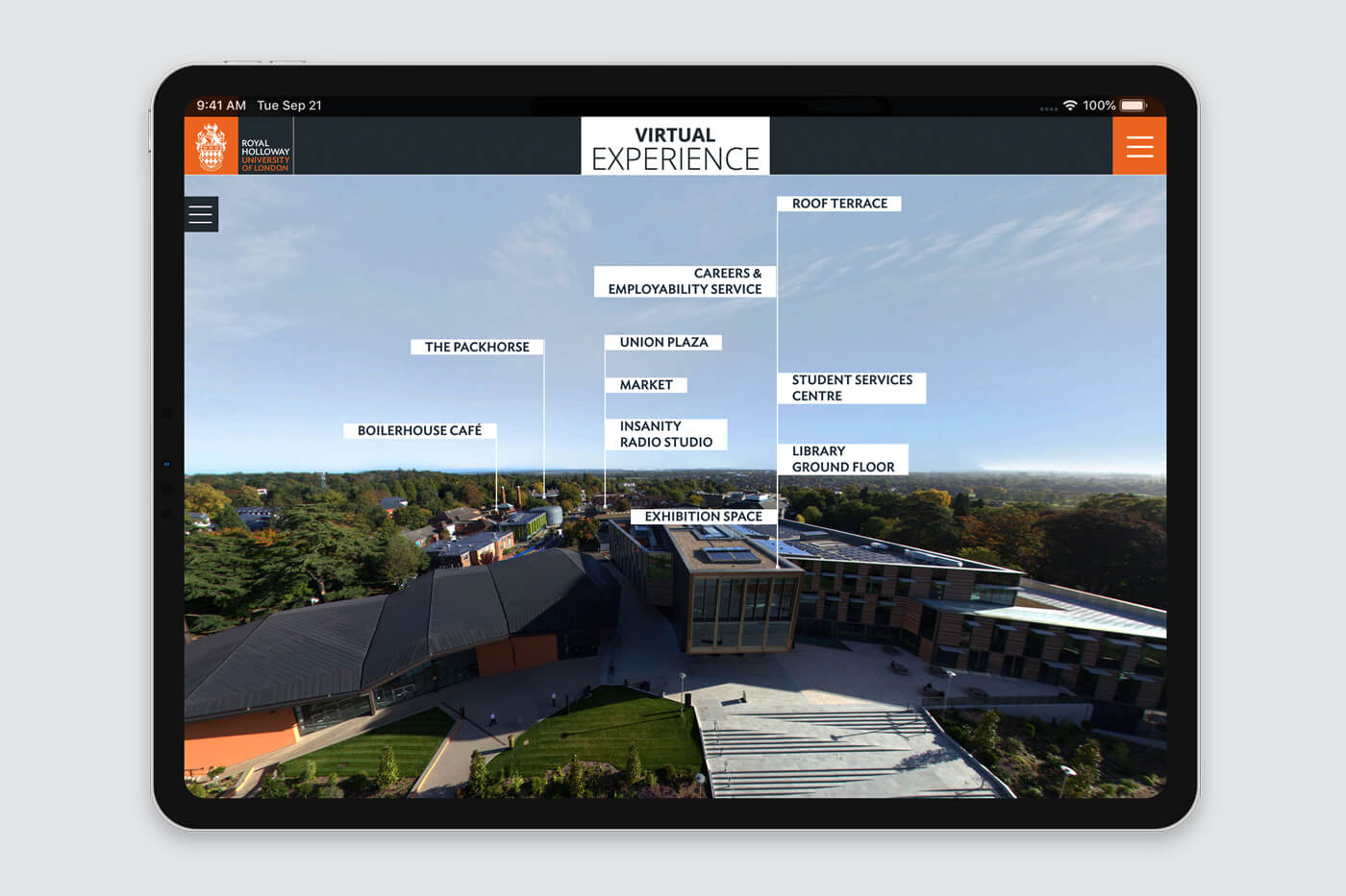Developing Royal Holloway’s Virtual Experience by re-structuring the user journey, improving existing content, adding new locations & hotspots, and introducing a more accessible, intuitive UI.